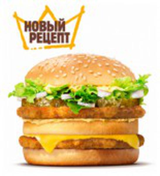 Состав: Легендарный бургер теперь с курицей! Кроме двух фирменных куриных котлет и ломтика сыра, в состав входят фирменный соус биг кинг, листовой салат, маринованные огурчики, свежий лук — и все это на подрумяненной булочке с кунжутом.