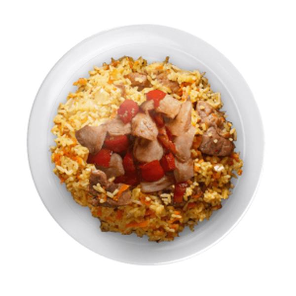 Состав: Рис, свинина, болгарский перец, жареный лук, чесночное масло, соевый соус.